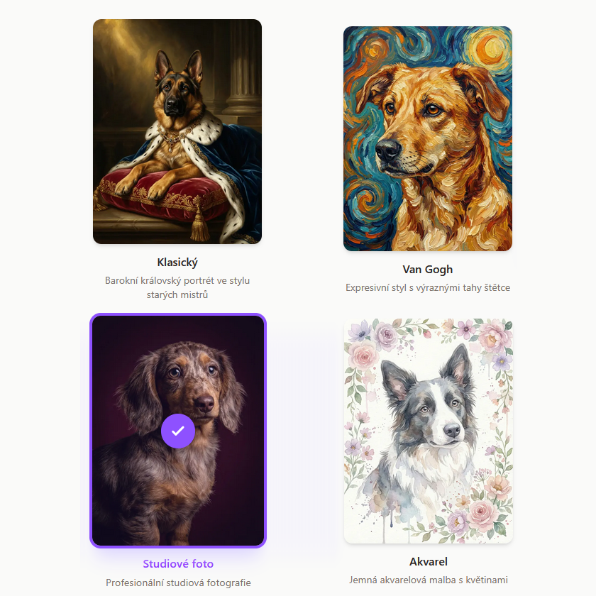 Zvolte si z našich 6 unikátních uměleckých stylů – od klasického barokního portrétu přes expresivní Van Gogh, studiové foto a akvarel až po černobílé studio a kresbu tužkou.